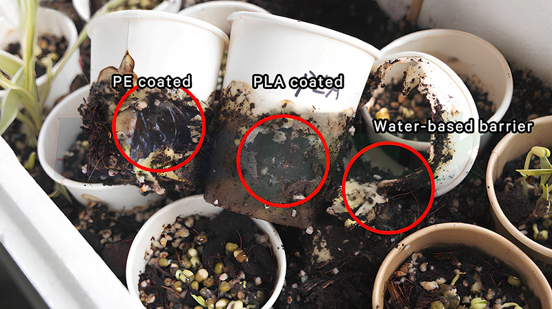 Después de 245 días, la taza de papel con forrado acuoso se había degradado por completo, las fibras de PLA se habían degradado, la película de PLA hadrupturada y la película de PE estaba básicamente intacta.